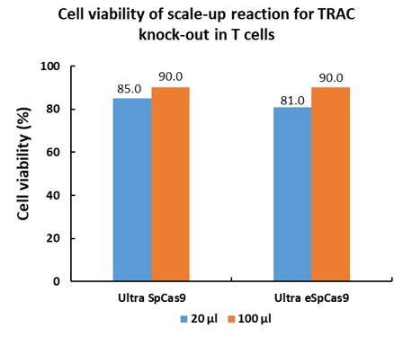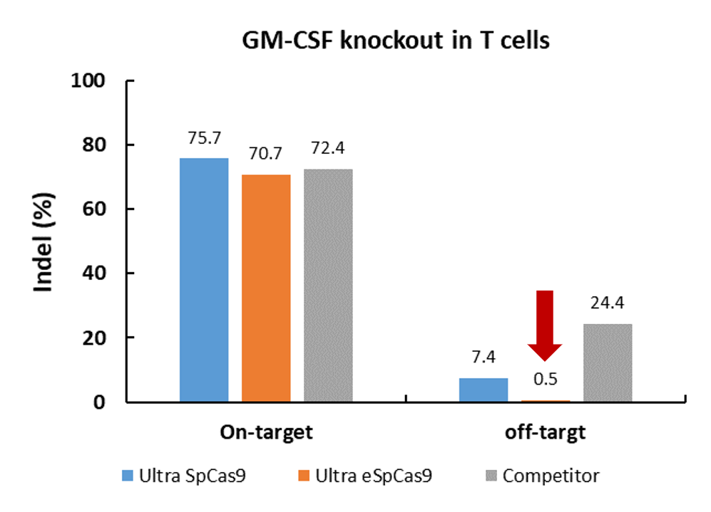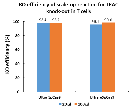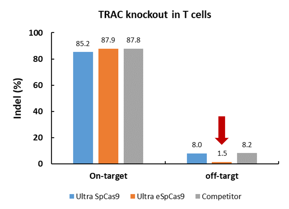 图1: 不同级别Cas9蛋白在原代T细胞的TRAC基因敲除实验的基因敲除效率分析。分别使用RUO级别和GMP级别的野生型和突变型Cas9蛋白,搭配金斯瑞合成的sgRNA ,通过电转方式对人原代T细胞进行TRAC基因敲除实验。该结果表明GMP级别的Cas9蛋白在T细胞的TRAC位点敲除实验中,与RUO级别Cas0蛋白产品拥有高度一致的基因敲除效率,敲除效率均为95%以上。随着开发项目逐渐向临床阶段推进,可以较快的从RUO级别Cas9蛋白产品转换到GMP级别Cas9蛋白产品。